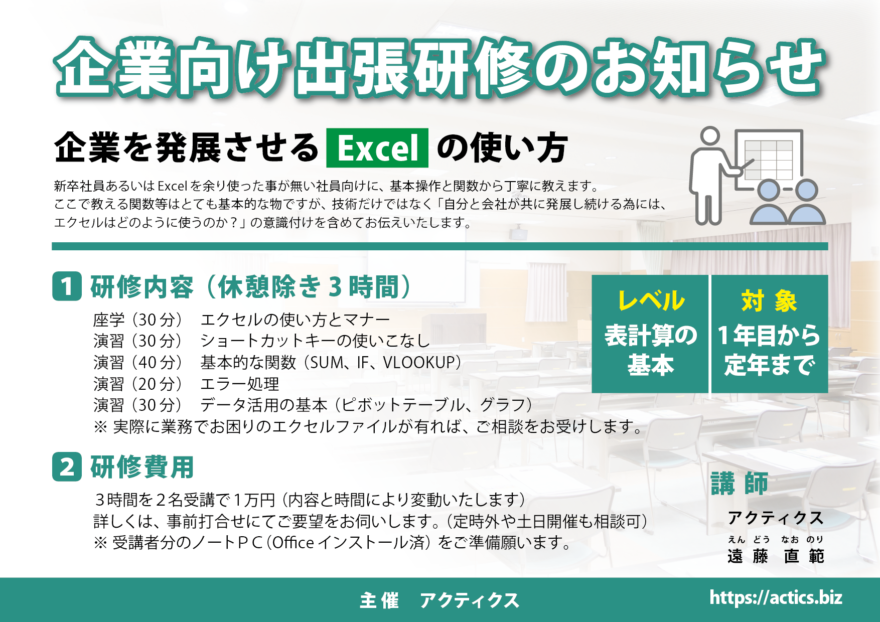 | Excel研修(初級~中級) | 1万円/3時間 |