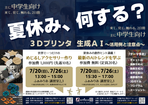 3Dプリンタを使ったものづくりと、最新の生成AIに触れる2つの魅力的な講習会です。