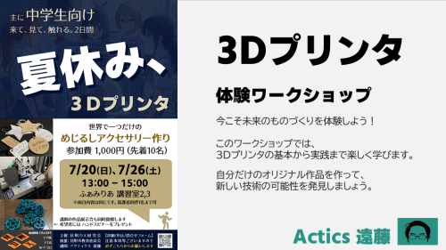 - 特徴: 近隣自治体の体験会(名前を入力し印刷するだけの 思い出コース として本会でも選択可能)では提供されない本格的なゼロからのものづくりを重視。参加者が自宅で3Dプリンタを活用できるよう、実践的なスキルを習得するカリキュラムを設計。